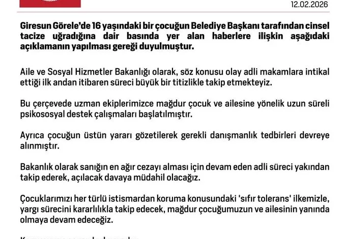 Aile ve Sosyal Hizmetler Bakanlığından, Giresun Görele’de 16 yaşındaki çocuğun cinsel tacize uğradığına dair basında yer alan haberlere ilişkin yapılan açıklamada, “Aile ve Sosyal Hizmetler Bakanlığı olarak, söz konusu olay adli makamlara intikal ettiği ilk andan itibaren süreci büyük bir titizlikle takip etmekteyiz. Bu çerçevede uzman ekiplerimizce mağdur çocuk ve ailesine yönelik uzun süreli psikososyal destek çalışmaları başlatılmıştır” ifadelerine yer verildi.