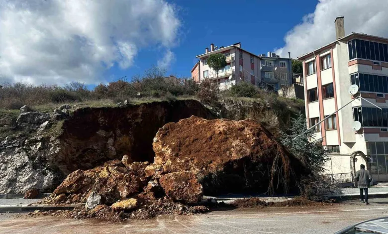 Balıkesir’in Dursunbey ilçesinde dev kaya parçası topraktan ayrılarak yaya kaldırımı üzerine düştü. Yol yek taraflı olarak trafiğe kapatıldı ve sürücüler uyarıldı.