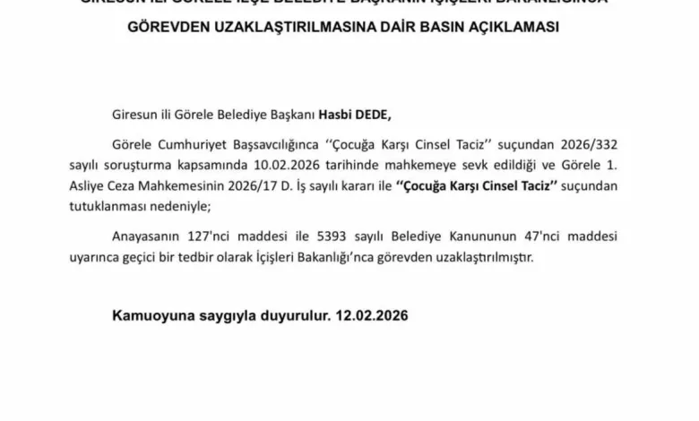 Giresun’un Görele Belediye Başkanı Hasbi Dede, Görele Cumhuriyet Başsavcılığınca ‘çocuğa karşı cinsel taciz’ suçundan 2026/332 sayılı soruşturma kapsamında 10 Şubat tarihinde mahkemeye sevk edildi. Görele 1. Asliye Ceza Mahkemesinin 2026/17 D. iş sayılı kararı ile tutuklanan Dede, Anayasa’nın 127’nci maddesi ile 5393 sayılı Belediye Kanunu’nun 47’nci maddesi uyarınca İçişleri Bakanlığınca görevden uzaklaştırıldı.