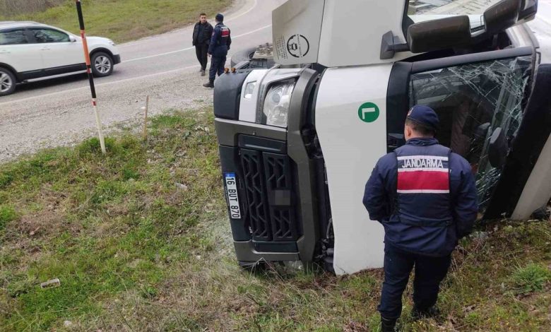 İnegöl’de su yüklü tır yamaca devrildi: 1 yaralı