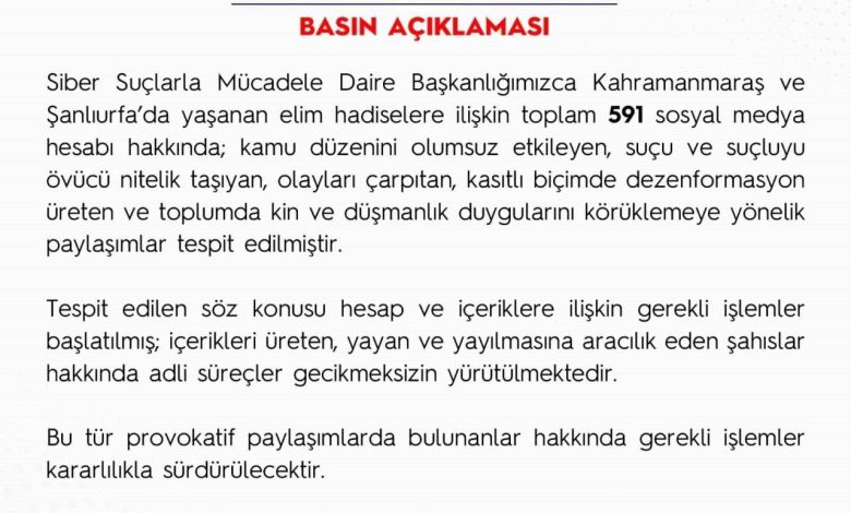 Emniyet Genel Müdürlüğü (EGM) tarafından yapılan açıklamada, “Siber Suçlarla Mücadele Daire Başkanlığımızca Kahramanmaraş Şanlıurfa’da yaşanan elim hadiselere ilişkin toplam 591 sosyal medya hesabı hakkında; kamu düzenini olumsuz etkileyen, suçu ve suçluyu övücü nitelik taşıyan, olayları çarpıtan, kasıtlı biçimde dezenformasyon üreten ve toplumda kin ve düşmanlık duygularını körüklemeye yönelik paylaşımlar tespit edilmiştir. Tespit edilen söz konusu hesap ve içeriklere ilişkin gerekli işlemler başlatılmış; içerikleri üreten, yayan ve yayılmasına aracılık eden şahıslar hakkında adli süreçler gecikmeksizin yürütülmektedir. Bu tür provokatif paylaşımlarda bulunanlar hakkında gerekli işlemler kararlılıkla sürdürülecektir” ifadelerine yer verildi.