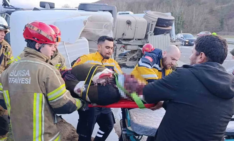Bursa’nın İnegöl ilçesinde kontrolden çıkan beton tankerinin devrildiği kazada sürücü ağır yaralandı.