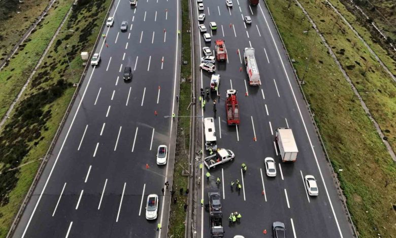 Kuzey Marmara Otoyolu’nda 1 polis memurunun şehit olduğu ve 16 polis memurunun yaralandığı kaza yeri dron ile görüntülendi.