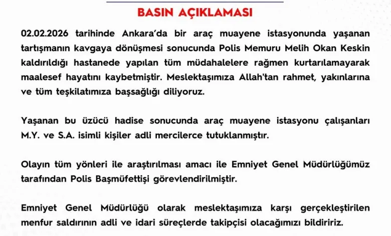 Ankara’da 2 Şubat’ta bir araç muayene istasyonunda yaşanan tartışmanın kavgaya dönüşmesi sonucunda yaralanan polis memuru Melih Okan Keskin, kaldırıldığı hastanede yapılan tüm müdahalelere rağmen kurtarılamayarak hayatını kaybetmişti. Olayla ilgili gözaltına alınan M.Y. ve S.A., sevk edildikleri mahkemece tutuklandı.