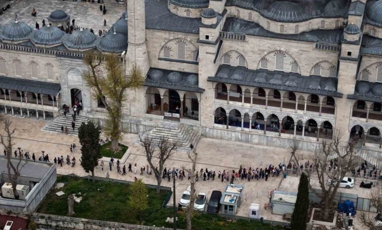 Sultanahmet Camii’nde restorasyon çalışmalarının tamamlanmasının ardından artan ilgiyle birlikte cami çevresinde uzun ziyaretçi kuyrukları oluştu. Tarihi ibadethane havadan görüntülenirken, yerli ve yabancı turistlerin yoğunluğu dikkat çekti.