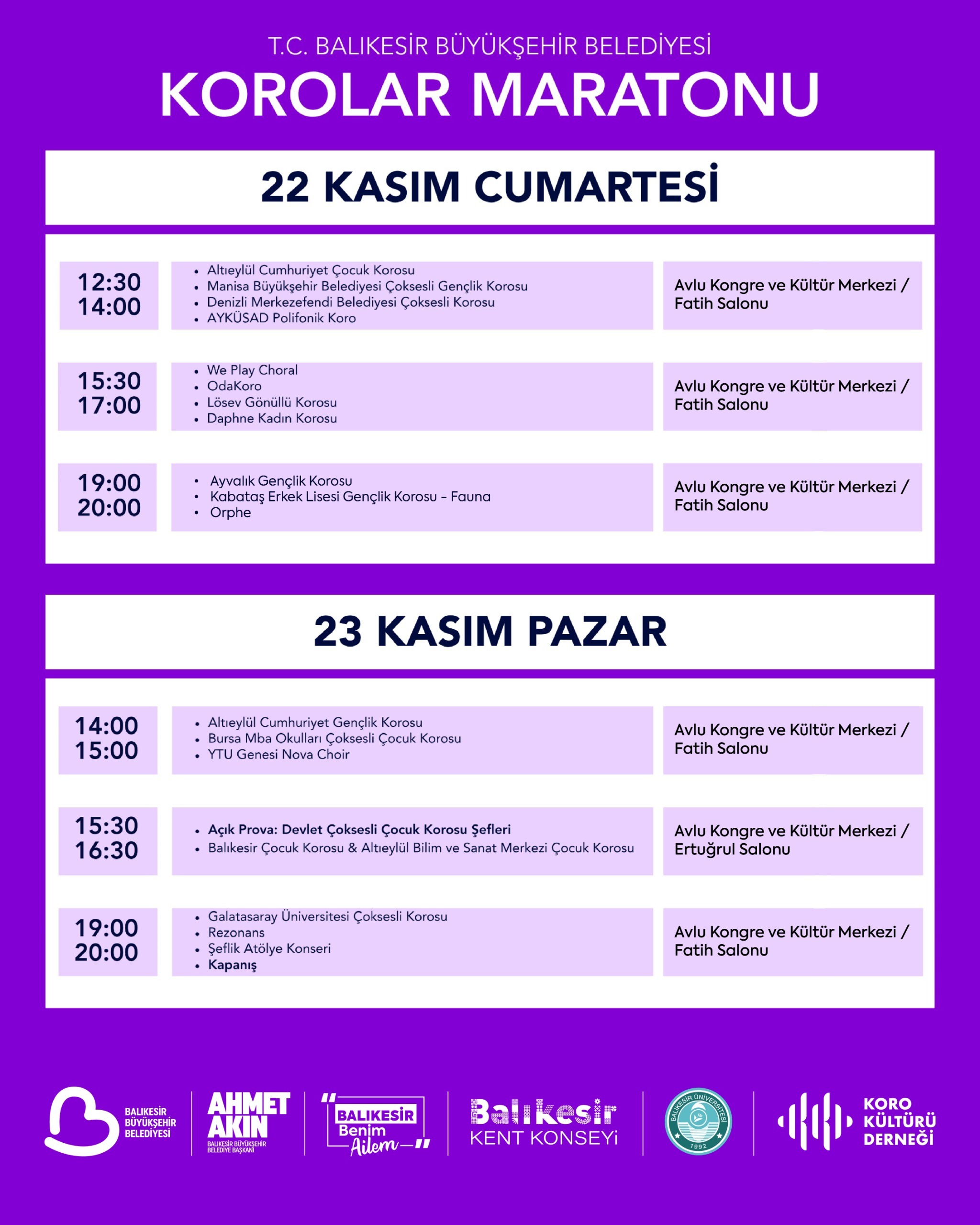 İki gün boyunca devam edecek olan Korolar Maratonu birbirinden keyifli programlara sahne olacak. 22 Kasım Cumartesi günü saat 12.30’da Altıeylül Cumhuriyet Çocuk Korosu ile başlayacak olan maraton 23 Kasım Pazar günü saat 20.00’deki kapanış programı ile son bulacak. Programda ilgi görmesi beklenen programlar arasında Müzik Öğretmenleri Eğitim Programı Konseri, Orff Atölyesi-İki Yakanın Yankısı, Erdal Tuğcular-Söyleşi ve Korolar Maratonu Açık Prova yer alıyor.